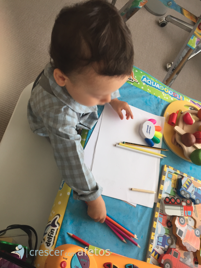 Perto dos 2 anos os movimentos dos dedos das mãos são mais precisos, assim as crianças são capazes de pegar em lápis. Ofereça canetas, marcadores, lápis de cor e papel para praticar os rabiscos e estimular a criatividade. Coloque as “pequenas obras de arte” em lugar de destaque.