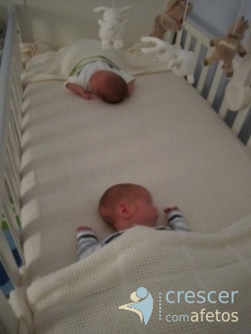 Quando pequenos podem ser colocados lado a lado, habitualmente durante o primeiro mês, com os pés a tocar a parede lateral do berço, segundo foto: